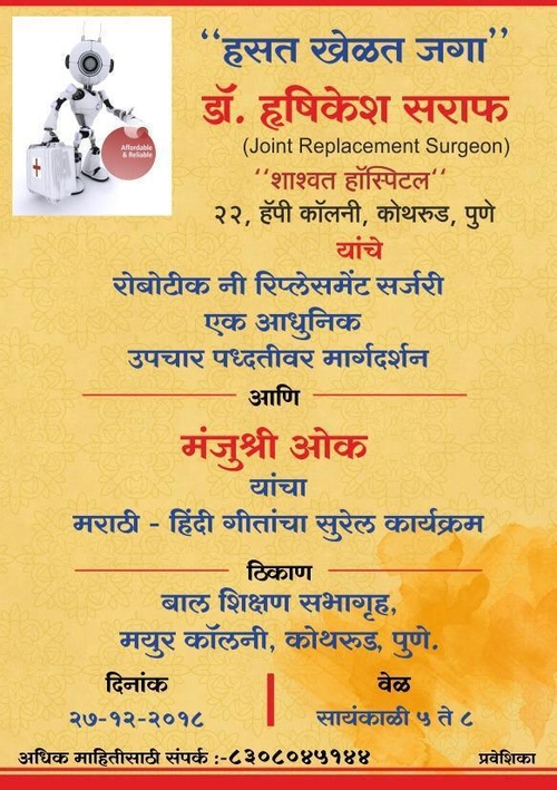 Lecture by Dr. Hrushikesh Saraf - Joint Replacement Consultant on Robotic Knee Replacement Surgery an Advanced Treatment for Knee Pain Followed by a Musical Program of Hindi and Marathi Songs by Manjusha Oak